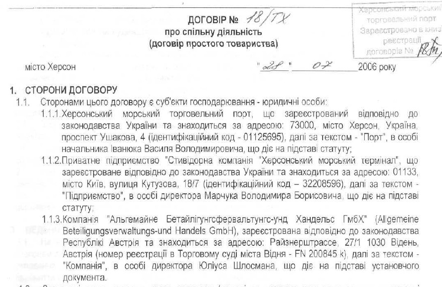ЧП “Стивидорная компания “Херсонский морской терминал” зарегистрирована в Печерском районе Киева по адресу: ул. Кутузова, 18/7. Фактически ЧП является “дочкой” австрийской фирмы, поскольку уставный капитал в 50,5 тыс грн полностью принадлежит ABH GmbH.