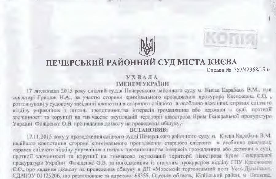 Были изъяты учредительные документы, балансы, финансовая отчетность за 2000-2015 годы, договоры аренды (фрахта) судов и т.д. Разрешение на проведение обыска накануне 17 ноября дал Печерский суд Киева. Основанием для обыска послужил якобы недопуск в порт комиссии фининспекции из “морского” Кировограда.
