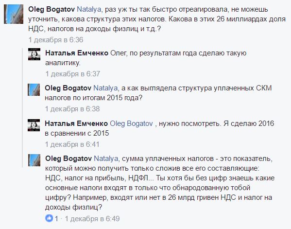 В марте директор по связям с общественностью и коммуникациям СКМ Наталья Емченко опубликовала пост по поводу перечисления структурами Рината Ахметова по итогам прошлого года “рекордных” 38 млрд гривен в отечественные бюджеты. На напоминание по поводу обещания сделать анализ структуры налогов уплаченных СКМ в 2016 году Емченко отреагировала в Facebook бессмысленным: “Задала вопрос” и продолжила заниматься своим традиционным словоблудием.