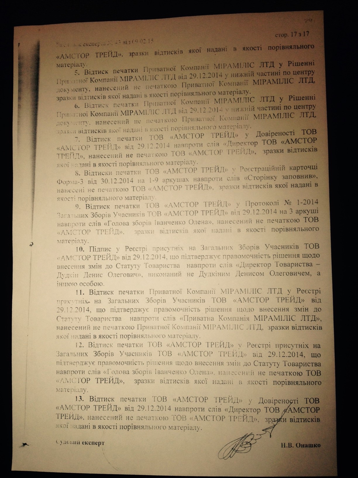 Из заключения эксперта видно, что были сфальсифицированы протокол общего собрания участников ООО “Амстор Трейд” от 29 декабря 2014 года, доверенность компании “Мирамилис” (владелец 100% уставного капитала ООО “Амстор Трейд”), а также договоры купли-продажи корпоративных прав.