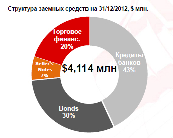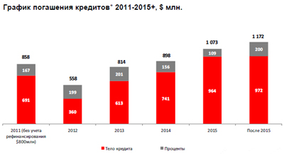 В ближайшие три года (2013-2015) “Метинвесту” будет необходимо погасить задолженность по кредитам в размере 2,785 млрд. долларов (без учета торгового финансирования). С его учетом сумма вырастает до 4 млрд. долларов. А приняв во внимание облигации, Seller’s Notes и долг перед Владимиром Бойко, “Метинвесту” до 2016 года будет необходимо погасить долг в 7 млрд. долларов.