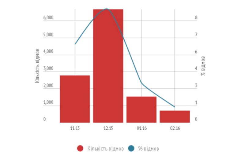 Как уточняется, в феврале 2016 года Нацбанком было отклонено лишь 706 операций по покупке валюты, по сравнению с 2,8 тыс. отказов в ноябре и 6,7 тыс. — в декабре 2015 года.
