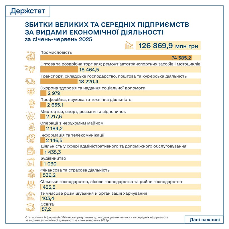В то же время совокупный ущерб за полугодие составил 126,9 млрд грн. Наибольшие суммы ущерба зафиксированы также в промышленности — 74,4 млрд грн, в торговле и ремонте автотранспорта — 18,5 млрд грн, а также в транспорте, складском хозяйстве, почтовой и курьерской деятельности — 18,2 млрд грн.